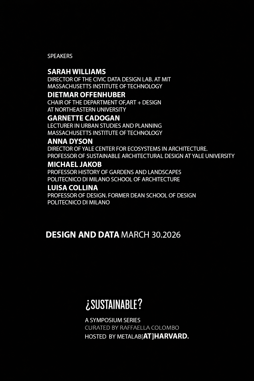 Assumes the form of a five-part online symposium series that critically interrogates the notion of sustainability. with a specific focus on landscape, communities, the built environment, and design, it promotes perspectives that deconstruct commonplaces and critically scrutinize claims of sustainability.